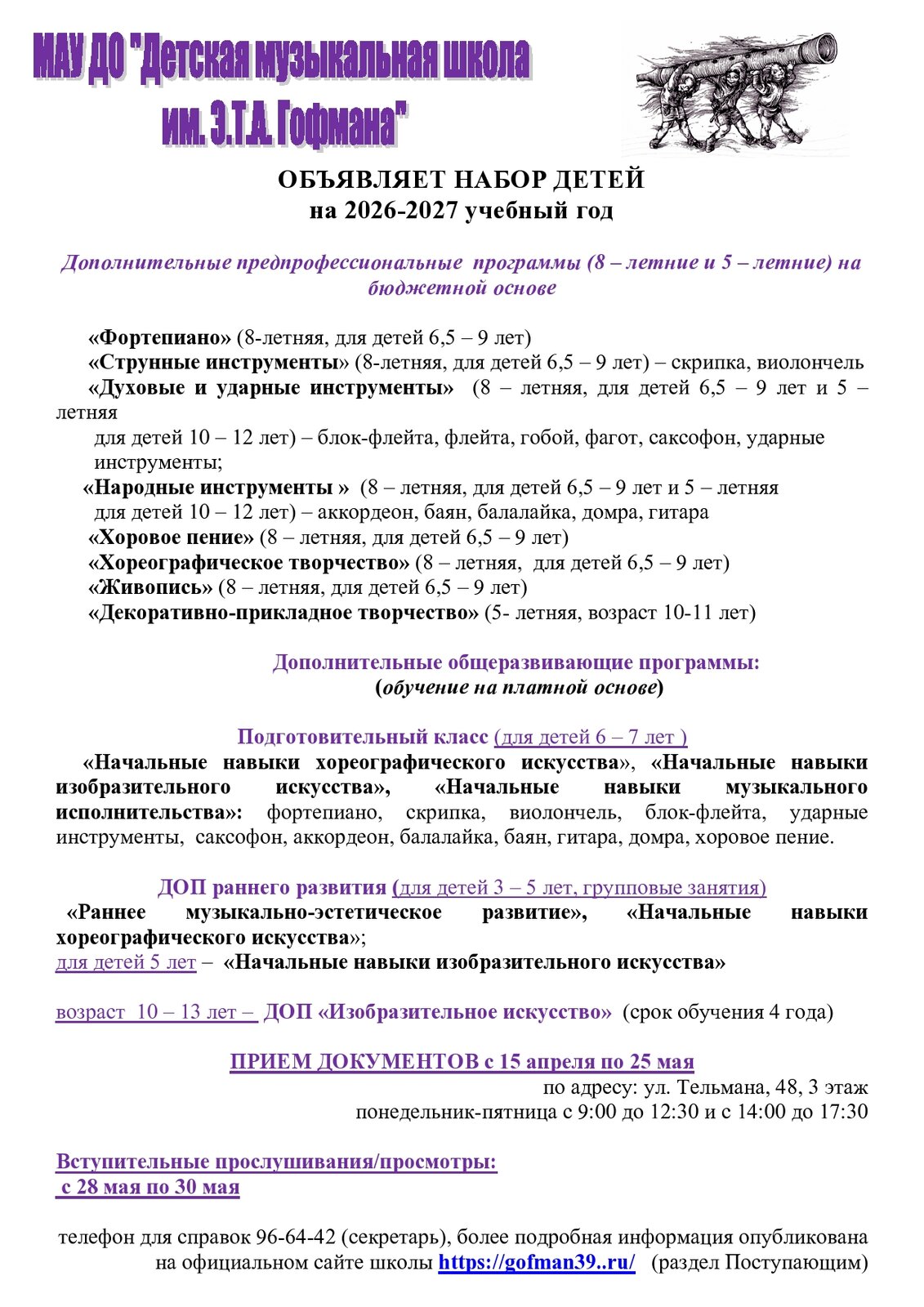 Детская музыкальная школа имени Гофмана - современный музыкально-эстетический, просветительский центр, играющий важную роль в культурной жизни г. Калининграда и области.