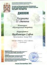 Учащаяся нашей школы Врублевская София (преподаватель Кишко М.В.) приняла участие в Четвертой Международной Олимпиаде по музыкальной грамоте и теории музыки «Четыре четверти», которая проходила заочно в городе Екатеринбурге. София завоевала звание Лауреатом II степени в номинации «Музыкальный теоретик».