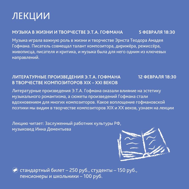 Лекции о значении музыки в творчестве Гофмана и влиянии писателя на композиторов XIX – XXI веков прочитает заслуженный работник культуры Российской Федерации, музыковед Инна Дементьева.