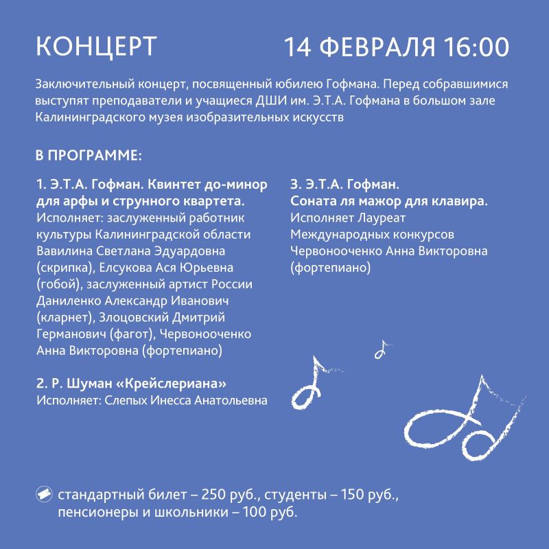31 января Музей изобразительных искусств совместно с Детской музыкальной школой им. Э.Т.А. Гофмана открывает фестиваль «Музыкальные неистовства капельмейстера Гофмана». Лекционно-музыкальный проект станет частью программы празднования 250-летия Э.Т.А. Гофмана и будет проходить по 14 февраля 2026 года.