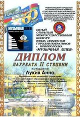 С 19 по 21 апреля в городе Новополоцке (Республика Беларусь) прошел V открытый Межгосударственный конкурс юных пианистов городов-побратимов г.Новополоцка «Музычная лілея». По результатам конкурсных прослушиваний ученица Е.С.Симоненко Анна Лукив была удостоена звания Лауреата II степени в возрастной группе 12-13 лет.